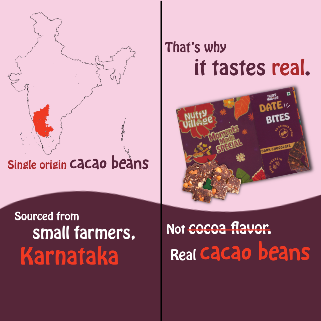 Each bite contains carefully selected dry fruits. Nuts and seeds add texture and nutrition. Cacao beans contribute natural antioxidants and depth of flavour.